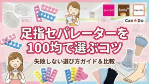近年、ダイソー、セリア、キャンドゥ、ワッツといった100円ショップのヘルスケアコーナーの充実は目を見張るものがあります。以前は簡易的なプラスチック製品しかありませんでしたが、現在はシリコン製の本格的なセパレーターや、パイル地の足指広げソックス、さらには外反母趾用パッドまでもが税込110円で手に入ります。